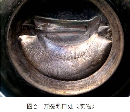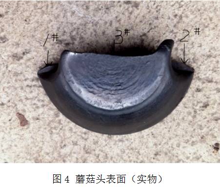 半軸擺輾模具中心斷裂掉下的半個蘑菇頭,蘑菇頭的斷口對應于半軸擺輾模具斷口,圖示上部分的第一條弧線為一次裂紋終止線,弧線上的多源臺階條紋更為清晰,下部分的第二條弧線更為突出,整體的斷口立體感更強,對分析說明更具說服力(見圖3)。