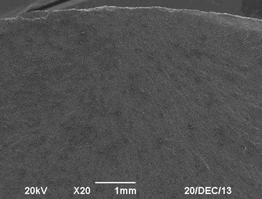 目測斷口的左側(cè)一半以上面積的區(qū)域色澤較淺,右側(cè)部位的色澤較深。斷口宏觀檢測,圖示左側(cè)為同心圓的多條圓弧推進(jìn)線,這是疲勞擴(kuò)展的斷口特征形貌,同心圓的圓心為疲勞源。斷口的右側(cè)呈放射狀快速斷裂特征,右側(cè)邊緣的傾斜部位為終斷區(qū)剪切唇(見圖2)。