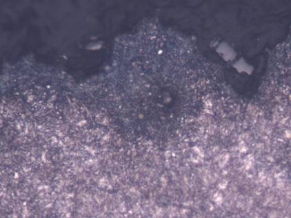 斷口開裂初期呈平直的穿晶狀態(tài),這種穿晶形態(tài)屬于疲勞擴(kuò)展的特征形貌。表層及次表層組織為調(diào)質(zhì)狀態(tài)的馬氏體位向索氏體,馬氏體位向的組織較為粗大(見圖9)。裂紋擴(kuò)展后期,斷口呈凹凸不平的沿晶斷裂特征。沿粗大斷口的凸出晶粒表面,斷續(xù)分布大小不等的圓弧凹坑,這是典型的沿晶韌窩斷口形貌,屬于過熱特征組織。斷口附近有非金屬夾雜物熔融的孔洞,表明原始軋制或鍛造溫度過高,硫化物夾雜已經(jīng)熔化為孔洞,顯著降低了材料強(qiáng)度,增加材料脆性(見圖10)。