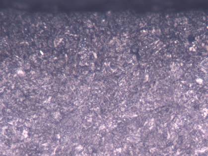 樣塊左側(cè)的表層相距不足10mm長度范圍內(nèi),斷續(xù)分布數(shù)十條表面微裂紋,裂紋沿表層圓弧狀凹坑底部開裂。根據(jù)金相組織檢查初步推斷,表層的凹坑是工件表面鍍鋅過程中,酸洗時間過長留下的腐蝕坑。表面微裂紋的深度在0.10~0.20mm。表層密集分布的黑色點狀組織是表面鍍鋅層,白亮色塊狀組織為脫碳層中的鐵素體組織。經(jīng)測量鍍鋅層為0.04mm,脫碳層為0.10mm,其中全脫碳層為0.04mm,半脫碳層為0.06mm(見圖7)。樣塊右側(cè)的表層灰黑色鍍鋅層更加明顯。右側(cè)的脫碳層深度與左側(cè)的脫碳層相近,心部組織仍然是保持馬氏體位向的索氏體組織(見圖8)。