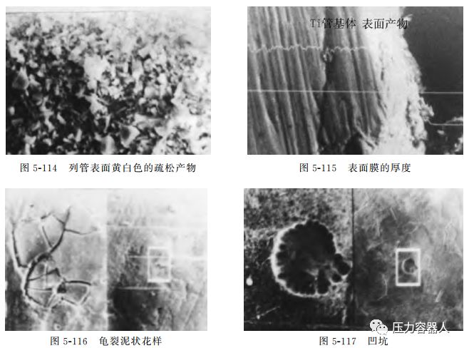 某廠的汽提塔鈦管對分布于不同位置的10 根氣提管進行跟蹤測量, 結果表明, 減薄區距上管口400mm 處趨于明顯, 500mm 處最大, 至800mm 處恢復正常。氣提管上部局部出現的減薄遠遠超出了減薄率<0.05mm· a-1 設計要求, 大大縮短了氣提塔的使用壽命。對氣提管取樣解剖分析, 管內有壁黃白色的疏松黏附物, 見圖5-114。