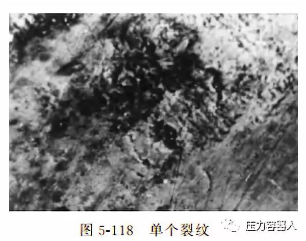 采用能譜X 射線掃描并結合電鏡觀察確定表面膜的厚度為20~40μm, 見圖5-115, 比正常的氧化膜、陽極鈍化膜或高溫大氣氧化膜厚得多。但表面膜與基體的結合力很低, 用HNO3 +HF 混合液清洗3~4min 后, 即成塊脫落。電鏡觀察發現表面膜呈現有龜裂泥狀花樣、凹坑、溝槽或單個裂紋,見圖5-116~圖5-118。