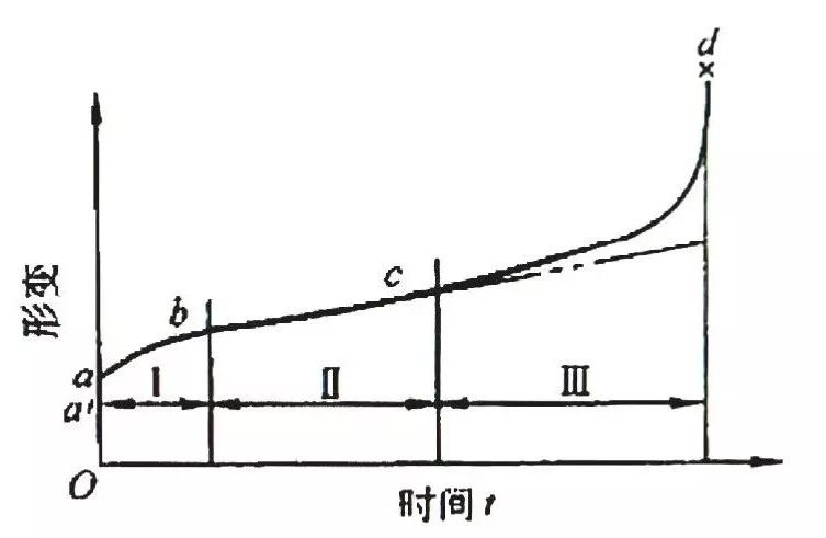 區(qū)域Ⅲ(cd)即第三階段,是加速蠕變階段,當(dāng)變形達(dá)到c以后,蠕變速度迅速增加,達(dá)到d時(shí)斷裂。