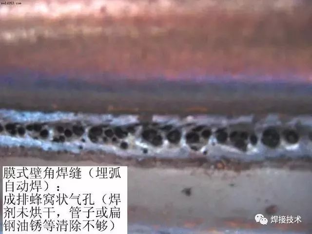 埋弧焊:出現(xiàn)成排蜂窩狀氣孔,成因大致為焊劑未烘干、工件油銹等清理不夠