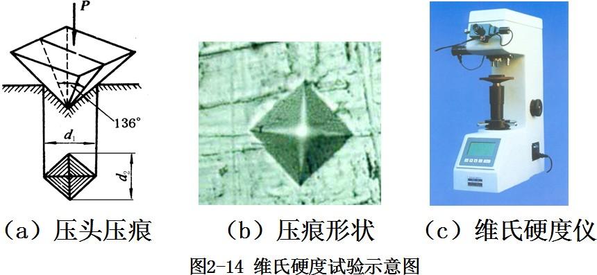 維氏硬度是用兩對對面體的夾角均為136°的金剛石四面體菱形壓頭來測定的。它是通過測量壓頭壓入部分的對角線長度(圖2-14)來計算的。