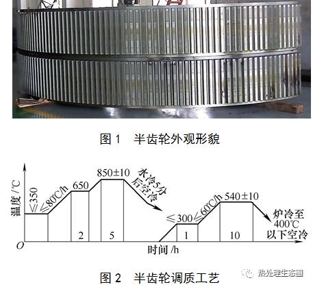 礦山設備工件的預先熱處理有退火、正火、調質三類。礦山設備通常外形比較龐大,其組成部件,如箱體、外筒、大齒輪等都屬于大件。其中大件以調質(淬火加高溫回火)工藝最為復雜,淬火時受到鋼的淬透性、散熱條件以及淬火介質的限制,加之大件內部缺陷較多,在熱處理過程中會產生較大內應力,加大工件的變形量和工件開裂的危險性。因此,大件調質用階梯升溫加熱方式, 淬火冷卻可采用水冷, 雙液淬火等方式,要及時回火,并控制其升溫速度及冷卻方式。下面為半齒輪調質實例簡單介紹。