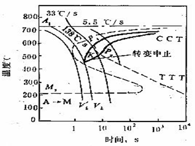 CCT曲線位于TTT曲線右下方。CCT曲線獲得困難,TTT曲線容易測得。可用TTT曲線定性說明連續(xù)冷卻時的組織轉變情況。方法是將連續(xù)冷卻曲線繪在C曲線上,依其與C曲線交點的位置來說明最終轉變產物。