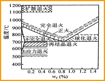 根據目的和要求分類,鋼的退火分為完全退火、等溫退火、球化退火、擴散退火和去應力退火。各種退火方式的加熱溫度如圖1所示。