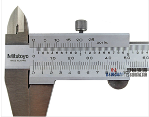 以刻度值0.05mm的日本三豐游標卡尺為例,讀數方法,可分三步