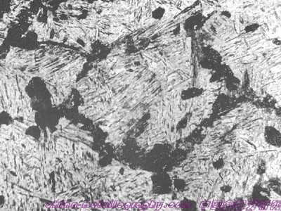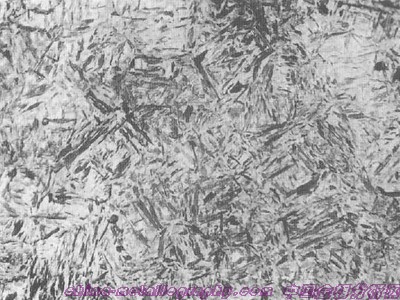 | 圖號:45-11 浸蝕劑:4%硝酸酒精 材料及狀態(tài):45鋼 處理:高頻感應(yīng)加熱淬火 組織及說明:基體組織為成排分布的粗大中碳淬火馬氏體。 由于高頻感應(yīng)加熱溫度過高。致使奧氏體晶粒 迅速長大,淬火后獲得成排分布的粗針狀馬氏體;這種組織將使鋼的脆性增大,內(nèi)應(yīng)力也較大,在使用時易發(fā)生開裂。 |