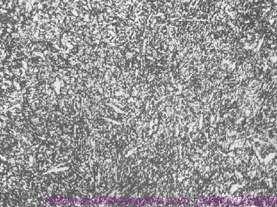 | 圖號:45-03 浸蝕劑:4%硝酸酒精 材料及狀態(tài):45鋼 處理:鍛造后正火處理 組織及說明:基體為片狀珠光體,白色為鐵素體,構(gòu)成網(wǎng)絡(luò)狀分布,晶粒大小極不均勻,大晶粒約為2~3級,細晶粒為8級。細晶粒聚集分布。 45鋼出現(xiàn)上述組織是由于高溫保溫時間較短、冷卻較快所形成的,出現(xiàn)粗大晶粒將會明顯降低材料的力學(xué)性能;可采用重新加熱、延長保溫時間后冷卻,組織可得到改善,性能也會隨之提高。 |