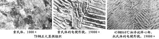 共析鋼過冷奧氏體在A1~550℃范圍內等溫轉變,由于在該范圍內轉變溫度比較高,奧氏體能全部分解,最后得到鐵素體和滲碳體所組成的機械混合物。在此溫度范圍內,由于過冷度不同,鐵素體和滲碳體的片層間距也不相同。轉變溫度越低,過冷度越大,片層間距越小,其強度和硬度就越高,塑性、韌性也有所改善。根據(jù)片層間距的大小,將珠光體型轉變產物通常又分為珠光體、索氏體和托氏體三種(見下表)。