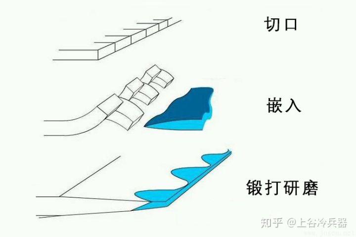 嵌鋼,則是在軟鋼上需要做刀刃的地方切開小口,再把一片高碳鋼嵌進去。具體過程如圖所示。相比較前兩種形式,嵌鋼可以隨意造出雙刃,也沒有不耐打磨的擔憂,同時也更節(jié)約材料,而且工藝簡單,容易批量生產(chǎn)。其性價比之高,使得古代不僅把這種技術(shù)應(yīng)用于刀劍,就連菜刀、剪刀、斧子等,都會采用這種工藝進行生產(chǎn)。