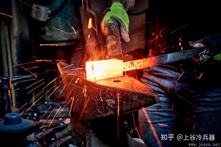 包鋼,是先用相對軟的鋼材(低碳鋼或熟鐵),鍛造出刀的基本形狀,再用一片薄薄的高碳鋼包裹住刀的一側(cè),最后鍛打成刃。這樣,刀刃部分就能足夠堅硬鋒利,而刀身部分也不至于因為太硬而容易折斷。