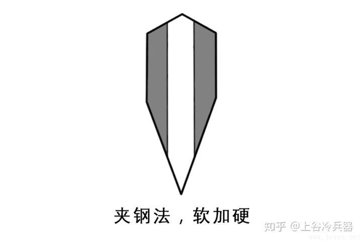 夾鋼與包鋼相反,是用較硬的鋼材做里,兩面夾軟鋼。兩邊的軟鋼有足夠的彈性,包裹住里面的高碳鋼,使得中間的鋼材即使彎折也不會斷裂。夾鋼可以制造出雙刃劍,打磨也不需要很小心,主體結(jié)構(gòu)的強度還更高。