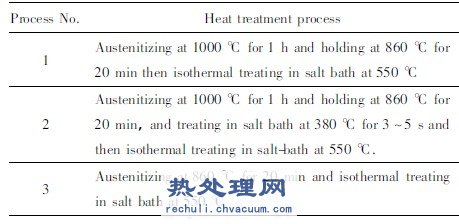 試驗所用材料為國產SWRS82B鋼盤條,直徑為12.5mm,主要成分(質量分數,%)為:0.80C,0.21Si,0.77Mn,0.20Cr,余量Fe。截取150mm長試樣分成3組。采用箱式電阻爐加熱,同時兩鹽槽溫度分別控制在380℃及550℃,通過前期的試驗結果分析后,制定了熱處理工藝見表1。