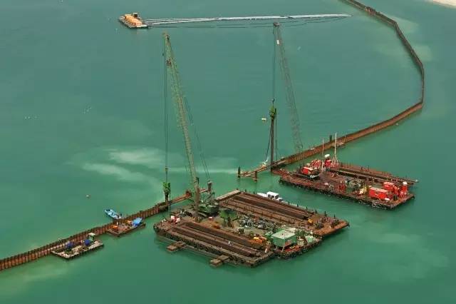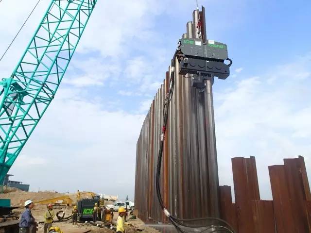 河里的防水圍堰。通常選用更寬點(diǎn)的6號(hào)樁。鎖口鋼板樁的長(zhǎng)度在15到24米之間,由416L型液壓振動(dòng)錘驅(qū)打。更復(fù)雜的可能含有礫石的土壤,可以選擇中等大小的錘,如815C。圍堰能為混凝土基礎(chǔ)的修建提供干燥的碼頭。橋塔建成之后,鋼板樁會(huì)被取出重新利用。需要避免使用泥漿和隔水墻的深基礎(chǔ)。有時(shí)候鋼板樁會(huì)與護(hù)筒樁配合使用,以獲得更大的側(cè)向承載力。這些應(yīng)用需要AZ 型鋼板樁,長(zhǎng)度為24 -36米。對(duì)于挖掘深度達(dá)到20米的情況,這些寬的鋼板樁很經(jīng)濟(jì),能提供很大的側(cè)向承載力。中等大小的815C或更大的1412C常被選來完成這些環(huán)保建設(shè)項(xiàng)目。