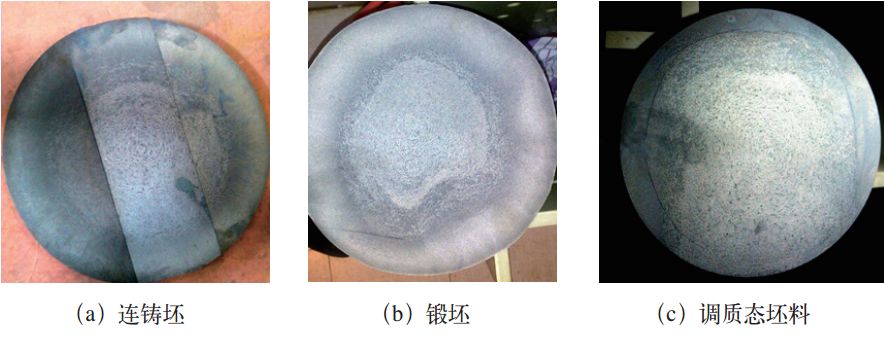 用材質(zhì)為42CrMo的連鑄坯生產(chǎn)的尾端件,在調(diào)質(zhì)后端部出現(xiàn)了環(huán)狀裂紋,在連鑄坯余料、鍛造余料、調(diào)質(zhì)后的尾端件端部各取一塊試片進(jìn)行低倍檢驗(yàn),低倍照片如圖1所示。從低倍結(jié)果可以看出,三個(gè)不同階段均存在明顯的疏松和偏析,連鑄坯的缺陷比較嚴(yán)重,經(jīng)鍛造后改善不大,調(diào)質(zhì)后環(huán)形裂紋出現(xiàn)的位置與偏析部位重合,由此可以看出,淬火裂紋產(chǎn)生的原因是由于原材料中存在的偏析缺陷造成的。淬火過程中組織轉(zhuǎn)變時(shí),由于偏析而產(chǎn)生不同的組織轉(zhuǎn)變或轉(zhuǎn)變時(shí)間不同,不同組織的膨脹系數(shù)不同而產(chǎn)生組織內(nèi)應(yīng)力,因此導(dǎo)致在偏析嚴(yán)重處產(chǎn)生淬火裂紋。