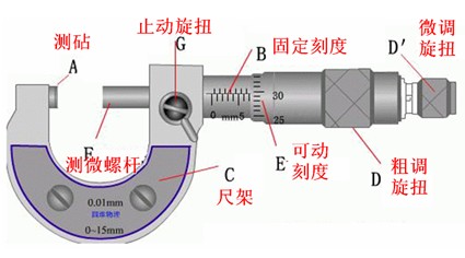 緩緩轉動微調旋鈕D′,使測桿(F)和測砧(A)接觸,到棘輪發出聲音為止,此時可動尺(活動套筒)上的零刻線應當和固定套筒上的基準線(長橫線)對正,否則有零誤差。