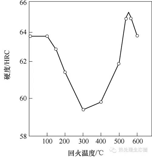 圖2 高速鋼(W18Cr4V)回火時的硬度變化(1280℃淬火)