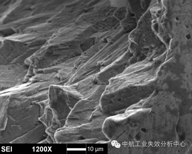 有的起源也不僅僅在一處位置起源,可能在多個位置均萌生疲勞源,這時我們就可以看到多個疲勞源之間產(chǎn)生類似臺階的特征,這是由于多處萌生裂紋并擴展過程中,不可能在一個平面上擴展,當裂紋相互交匯到一起時,必然通過剪切撕裂的方式使不同的擴展平面連接起來,從而形成臺階。