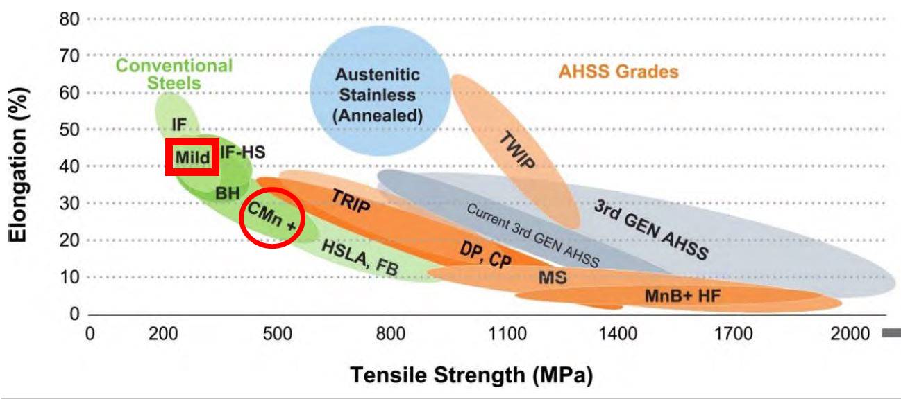 軟鋼這個(gè)名詞在不同的領(lǐng)域有不同的解釋,在汽車鋼中Mild Steel的定義被廣泛傳播的是國(guó)際鋼協(xié)(WSA)編制的【汽車先進(jìn)高強(qiáng)鋼應(yīng)用手冊(cè)】,也就是這張非常有名的香蕉圖。