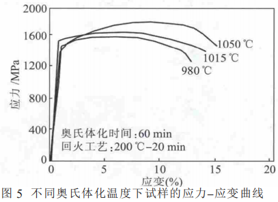 圖 5 為 不 同 奧 氏 體 化 溫 度 下 的 應 力-應 變 曲線。奧氏體溫度分別為 980、1015 和 1050℃,奧氏體化時間為 60 min, 奧 氏體化后均 在 200 ℃保 溫 60min 進行回火處理。從圖中可看出,隨著奧氏體化溫度的升高,其抗拉強度會有所升高但變化不明顯。在1050℃時,其抗拉強度達到 1800 MPa;這 主要是由于隨著奧氏體溫度的升高, 板條馬氏體的數量明顯增多,板條馬氏體屬于硬質相,其抗拉強度會升高,但是在這個溫度范圍內淬火, 中等大小的奧氏體晶粒長大,又會降低其抗拉強度。所以總的抗拉強度會升高但變化并不是很大。