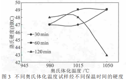 將鋼坯沿縱向進行切割至合適尺寸, 以用于熱處理試驗。試樣的奧氏體化溫度選擇為 980、1015 和1050℃,奧氏體化時間為 30、60 和 120 min,然后在將鋼坯沿縱向進行切割至合適尺寸, 以用于熱處理試驗。試樣的奧氏體化溫度選擇為 980、1015 和1050℃,奧氏體化時間為30、60 和120min,然后在200~700 ℃之間進行回火處理,回火時間為60min。將以上熱處理后的試樣進行強度和硬度測量、顯微組織觀察及 EDS 能譜分析。