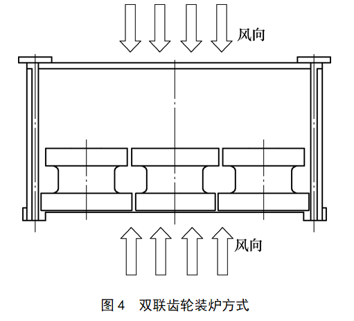 比如設(shè)備采用上下周期性風(fēng)冷,就不宜采用圖1的平放方式,因?yàn)榇藭r(shí)最外層的齒輪毛坯接觸到的風(fēng)量大,風(fēng)速快,形成的內(nèi)外溫差就很大,在這種情況下只能單層擺放,但生產(chǎn)效率將會(huì)大受影響。