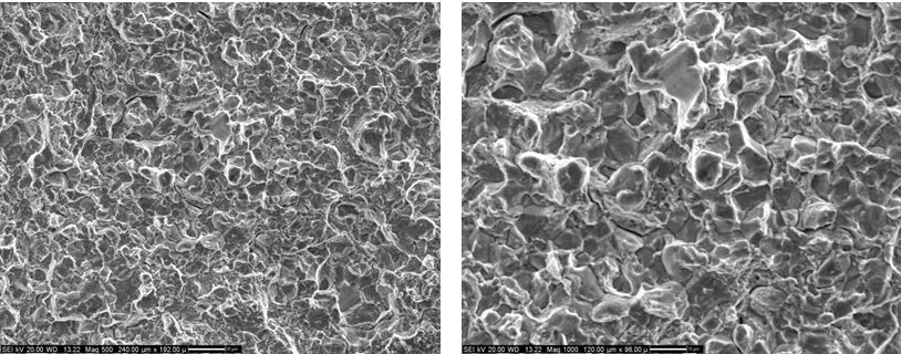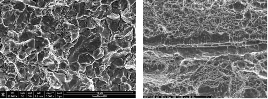 2#、3#裂紋斷口形貌相同。裂紋斷口宏觀較平整、未見明顯塑性變形,源區(qū)位于齒根端角(齒根與橫截面相交的端角)表面、小線源特征;齒根與橫截面相交的端角不夠圓滑,且加工面較粗糙,形貌如圖7、圖8所示。裂紋擴(kuò)展區(qū)主要為沿晶形貌,局部為韌窩形貌,如圖9、圖10所示;人為打斷區(qū)為韌窩形貌,如圖11所示。