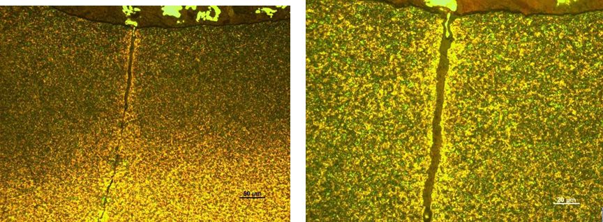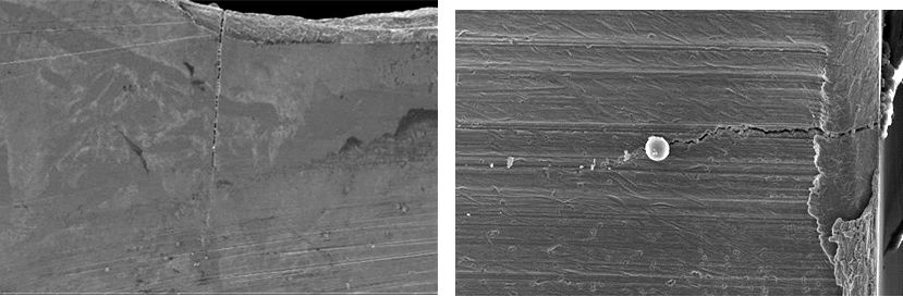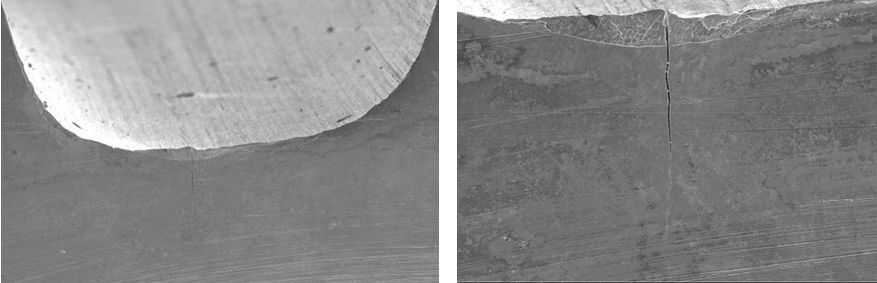 1#4#裂紋外觀比較相似,2#裂紋和3#裂紋如圖5、圖6所示,裂紋由齒根表面沿齒輪軸徑向和軸向向內(nèi)部擴(kuò)展,沿徑向較平直,沿軸向較曲折。其中,1#裂紋的徑向長(zhǎng)度為0.358mm、軸向長(zhǎng)度為1.295mm;2#裂紋的徑向長(zhǎng)度為0.354mm,軸向長(zhǎng)度為1.30mm3#裂紋的徑向長(zhǎng)度為0.334mm,軸向長(zhǎng)度為1.208mm;4#裂紋的徑向長(zhǎng)度為0.302mm,軸向長(zhǎng)度約為1.20mm