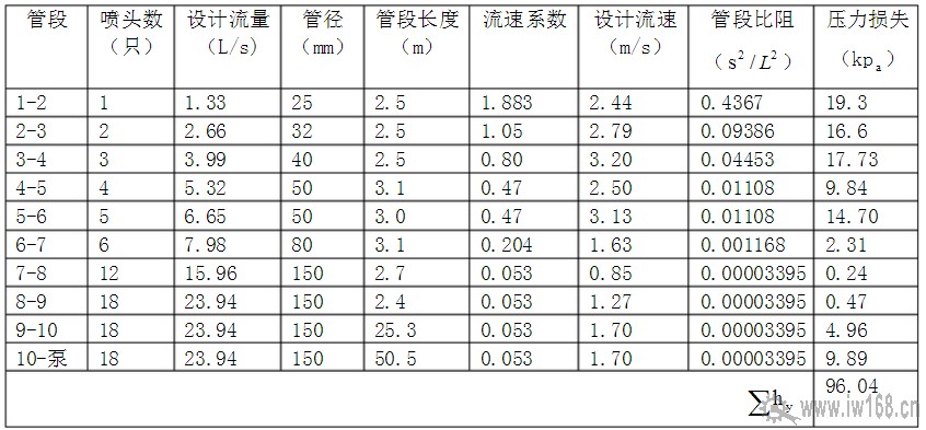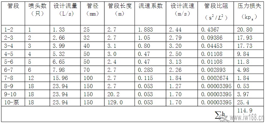 從系統最不利點開始進行編號,直至水泵處,從節點1 開始,至水池吸水管為止,進行水力計算。管段流量僅計算在作用面積范圍的噴頭,作用面積外的噴頭不計。