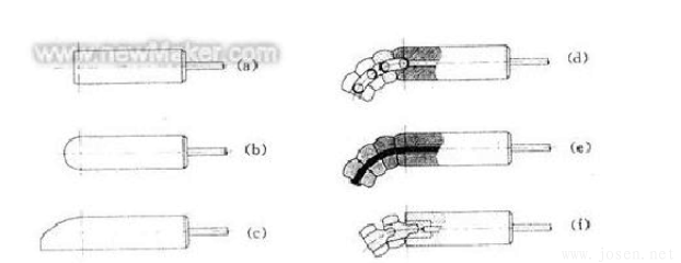 芯棒的形狀是多種多樣的,對于具有不同相對彎曲半徑或相對壁厚的管件,以及對其加工要求的不同,應選用不同的形狀芯棒。一般情況下,可將芯棒分為兩大類:一種為硬式芯棒(見圖3a、b、c),一種為軟式芯棒(見圖3d、e、f)