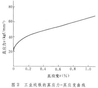 所示的條件應力-應變曲線上,并不能真實反映金屬的形變強化,這是由于在這種曲線上,各點應力均是以該點的載荷除以試樣的原始截面積來表示的,未考慮截面收縮;因此,塑性變形量越大,條件應力和試樣上所承受的真實應力的偏差也越大;“縮頸”后,由于局部區域截面積的急劇減少,這種偏差更大,出現應力超過后,強度隨應變的增加而降低的情況。真實力-真應變曲線能全面描述金屬從彈性變形開始直至斷裂的全過程的應力-應變關系,如圖2[工業純鐵的真應力-真應變曲線]