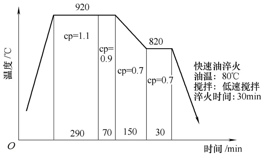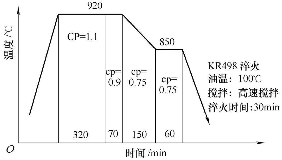 圖4是原淬火工藝,換用KR498淬火后,鐘形殼的芯部硬度及硬化層深度均達到要求,但仍然有22%的工件變形量超出變形范圍??紤]到碳勢、滲碳時間、淬火溫度及保溫時間、淬火油溫、攪拌頻率等因素對變形的出現有重要影響,所以后期通過適當延長滲碳時間、提高淬火保溫區碳勢、提高淬火溫度及保溫時間、降低淬火油溫、提高攪拌頻率來降低鐘形殼內腔的變形量;最終發現采用圖5所示熱處理工藝時,抽檢530只零件,僅5%的零件變形超標,表2為變形超標的0458D型鐘形殼熱處理后內圈尺寸。
