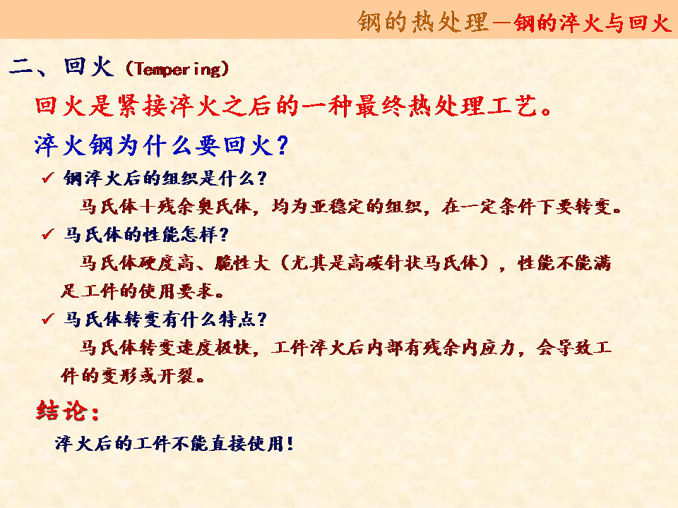 淬火后強(qiáng)度和硬度有了較大提高,但塑性和韌性卻顯著降低,此外,淬火工件內(nèi)部有較大內(nèi)應(yīng)力,如不及時(shí)處理,