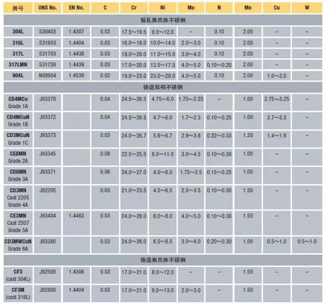 表1  鍛軋和鑄造雙相不銹鋼的化學(xué)成分*(重量%)