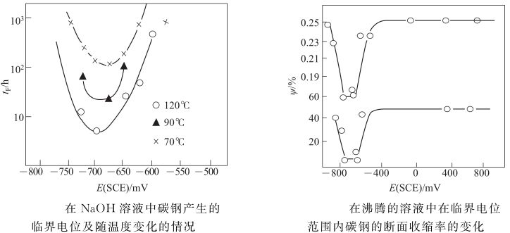 低碳鋼鋼在沸騰的質(zhì)量分?jǐn)?shù)為35%~40% NaOH 溶液中堿脆的敏感電位范圍為-1150~800mV ( SCE ),在沸點(diǎn) ( 120℃ )下鋼的堿脆發(fā)生在 -700mV ( SCE )左右的很窄電位范圍內(nèi),如下圖所示。