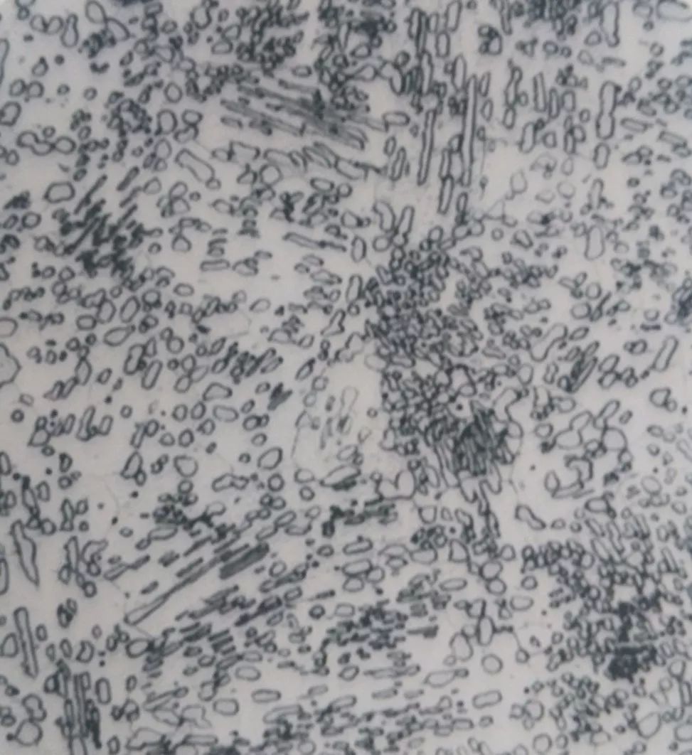 產生上述金相顯微組織的原因:由于球化退火加熱溫度過高或在偏高溫度下長時間保溫;裝爐量過多,爐內均溫性差;原材料碳化物不均勻性嚴重(如碳化物帶狀嚴重),在碳化物數量少的區域對過熱更為敏感。在正常工藝下仍有部分工件或工件局部加熱溫度過高或保溫時間長,容易引起局部過熱,形成粗片狀珠光體組織。使碳化物溶解較充分,在隨后的冷卻過程中,部分區域缺少作為珠光體轉變成核心的碳化物,以至不得不從比較均勻的奧氏體內重新產生核心而出現片狀。一般加熱溫度越高或在偏高溫度下保溫時間越長,退火組織中也越會形成粗片狀珠光體。這類組織硬度不高,粗片狀珠光體硬度更低。