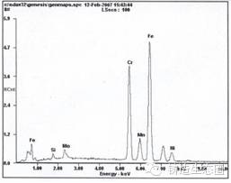為驗(yàn)證金相分析結(jié)果,采用掃描電子顯微鏡觀察圖2 A點(diǎn)處的能譜,得到如圖3及表2的結(jié)果。由表2可知,該組織確為δ鐵素體,它與奧氏體基體相比, Cr含量偏高,而Ni含量偏低,說(shuō)明此種固溶處理基本沒(méi)有達(dá)到預(yù)期的目標(biāo)。下一步將對(duì)固溶工藝進(jìn)行改變,以期得到100%的奧氏體組織。