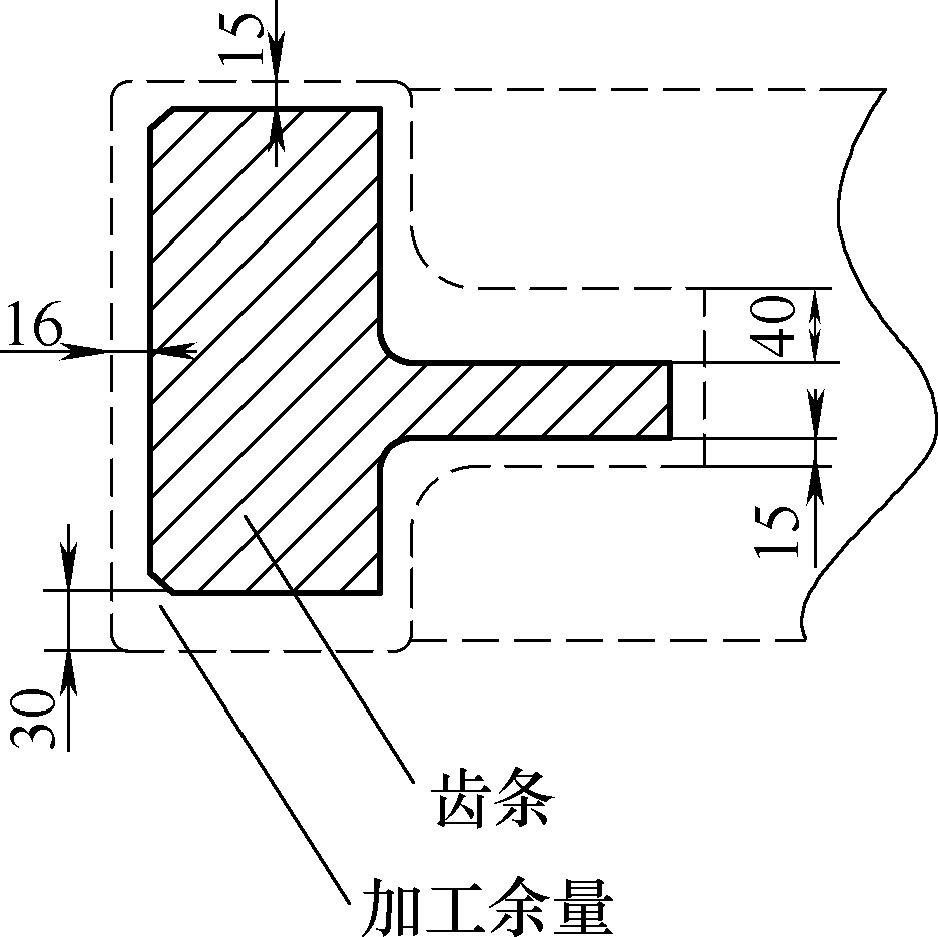 首先對齒條粗開齒后、熱處理前應力釋放后導致的變形進行檢測,根據變形情況選擇合適的加工余量。余量的選擇為:齒條采用粗開齒后進行調質,齒側每面留8mm余量,齒底留有25mm余量,外圓每面留16mm,幅板上下端面分別留40mm、15mm余量,確保一旦發生變形后有足夠加工余量將變形量擬補,為后續加工提供了保障,圖1為齒條加工余量示意。