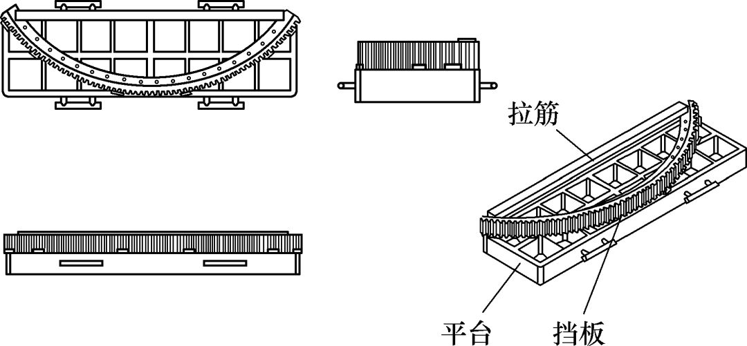 平臺上焊有6塊擋板,擋板采用Q235普通鋼板,規格為300mm×150mm×50mm,位置分布在沿齒條圓弧對稱焊接在平臺的橫梁上,齒條的弧頂兩側,齒條弧長的1/3處,以及齒條兩端,限制了齒條外延及弓度的變形,有效的防止了齒條在淬火時出現竄動。