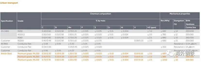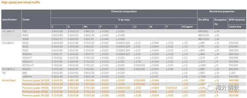 (5)BLF(BainiticLowFatigue)系列。貝氏體低疲勞鋼軌(BLF),即使在極端密集的交通密度和惡劣的條件下,也能提供優異的抗滾動接觸疲勞。有兩個等級,BLF320和BLF360,所有新的法國高速鐵路現在都使用BLF鋼軌。