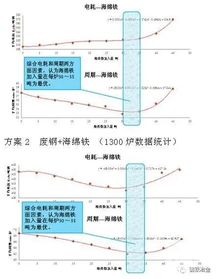 ⑵在鐵水固定(單罐重~40噸)的情況下,通過加入不同量的海綿鐵進行冶煉過程指標測算,以低電耗、短周期為最終確定最優海綿鐵加入量。