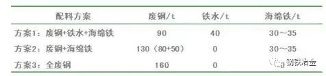 為應對鐵水或海綿鐵供應不及時造成斷料的現象,特制定三大類配料方案,其中一種為全廢鋼配料,另兩種為使用海綿鐵配料(“廢鋼+海綿鐵”和“廢鋼+鐵水+海綿鐵”)。