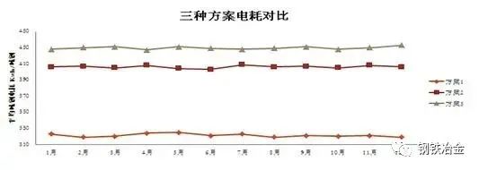 注:㈠通過上圖,每種配料方案的電耗在總體上控制比較平。