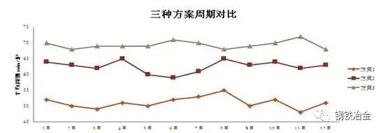 注:㈠通過上圖,每種配料方案的冶煉周期在總體上控制比較平穩,偶爾出現波動。