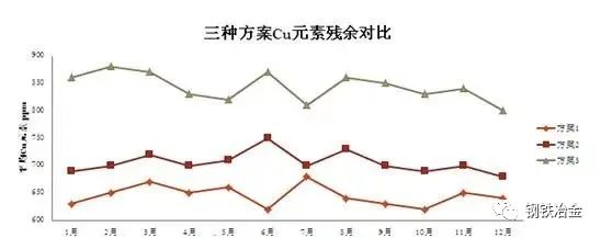 注:㈠通過上圖,每種配料方案的Cu元素殘余波動在±100ppm,總體比較平穩。