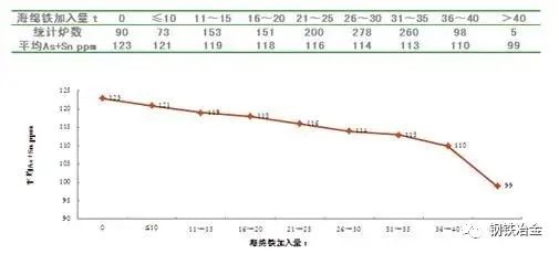 目前煉鋼廠對于“五害”元素的分析主要考慮砷(As)和錫(Sn),由于鐵水和生鐵的五害元素含量比較穩定。下面我們將海綿鐵不同的加入量對于砷(As)和錫(Sn)平均含量的影響進行比較,見下表。