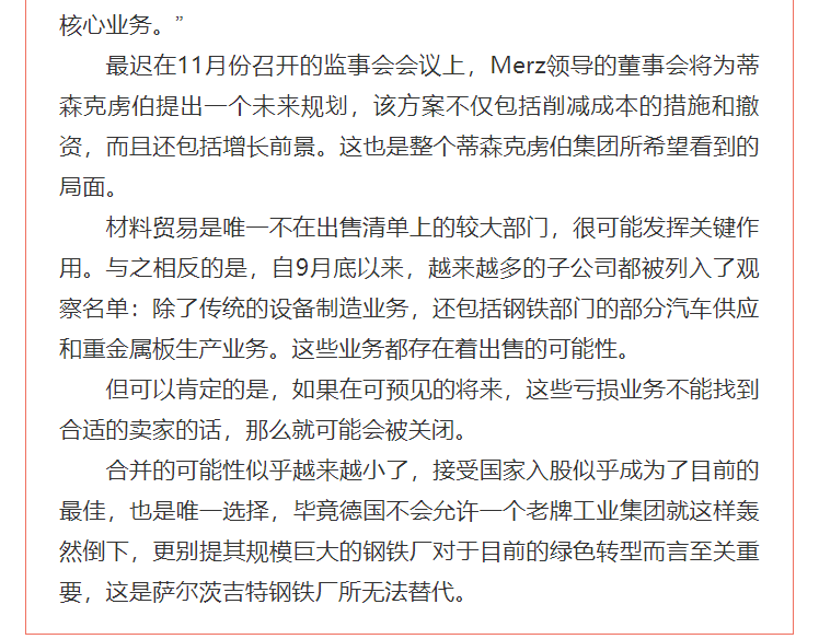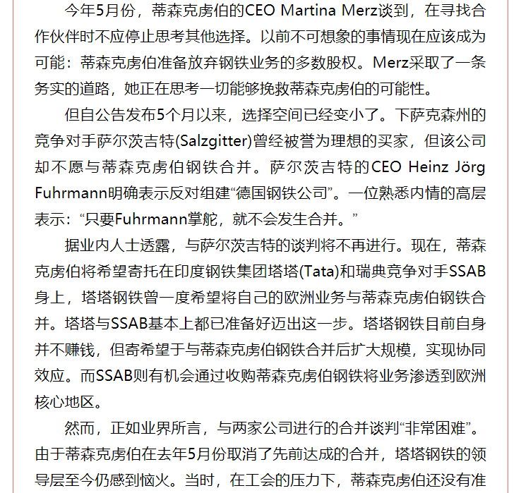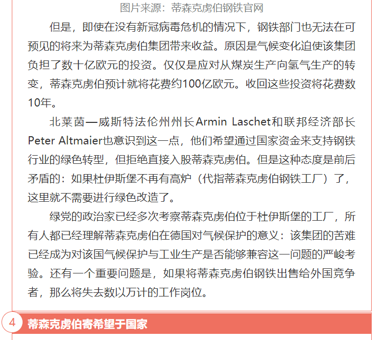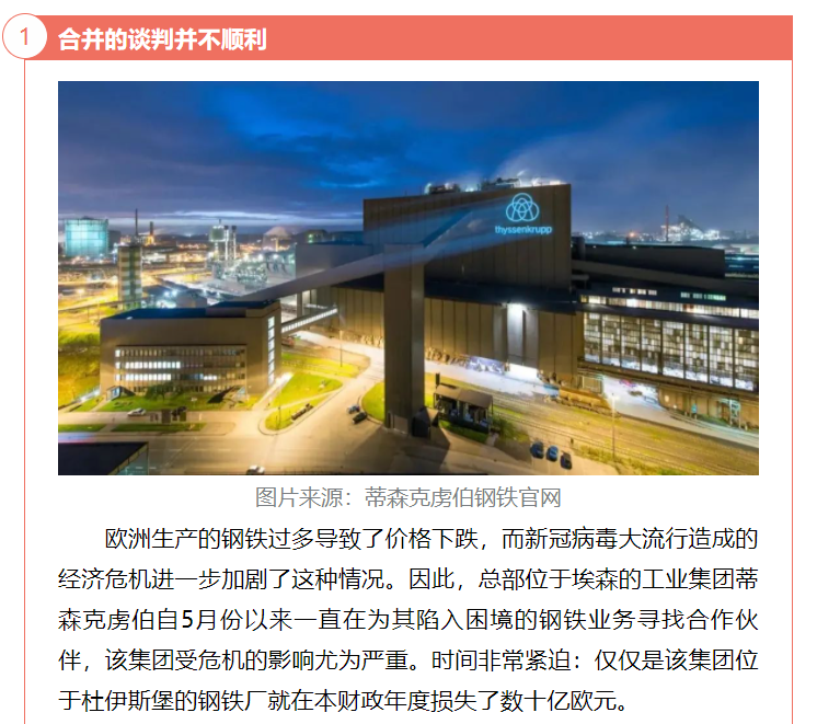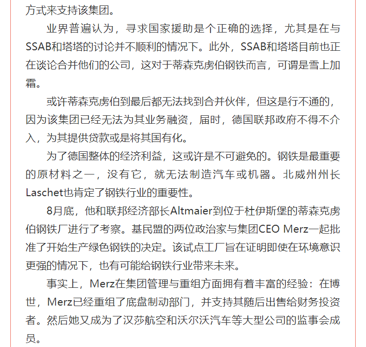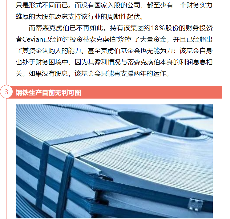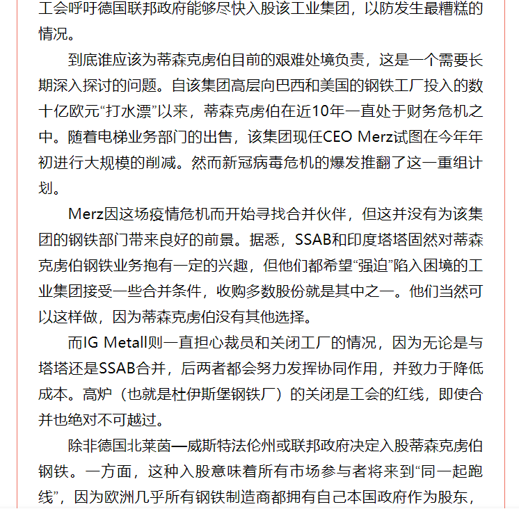 日前,有并購顧問公司對蒂森克虜伯自5月份以來一直為其陷入困境的鋼鐵業務尋找合作伙伴一事做出分析,認為國有化或為蒂森克虜伯最后的選擇。